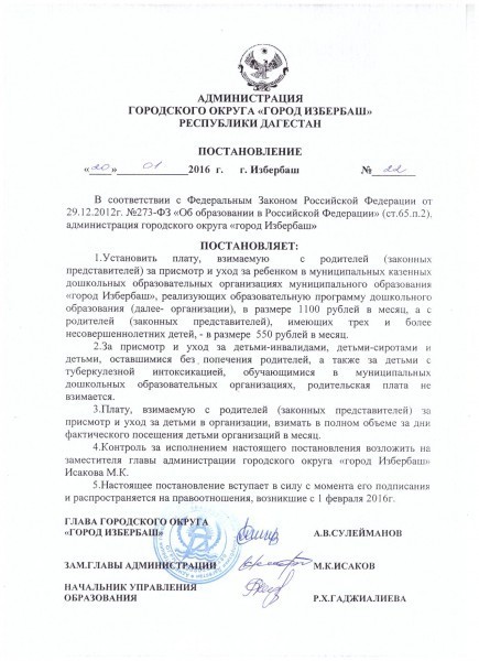 Выписка из приказа«Об утверждении оплаты за содержание детей в дошкольных образовательных учреждениях г.Избербаша»
